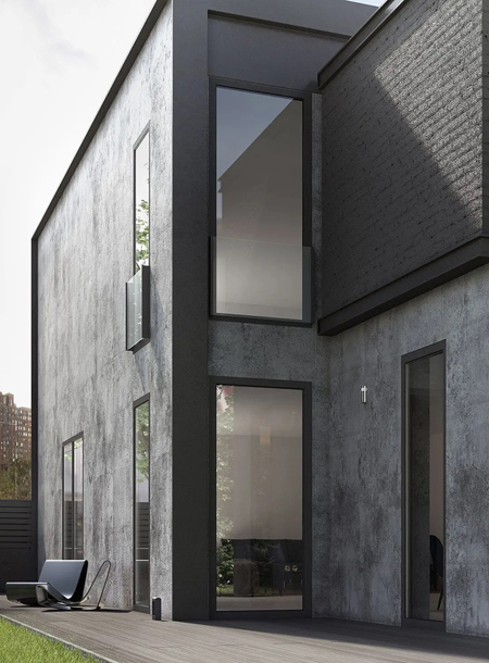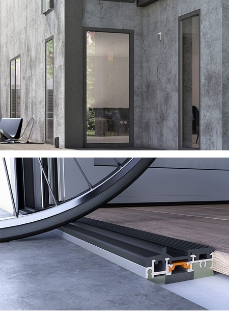 Il sistema offre uno stile moderno e minimale con la possibilità di installazione di ferramenta a scomparsa e soglia ribassata sulle portefinestre